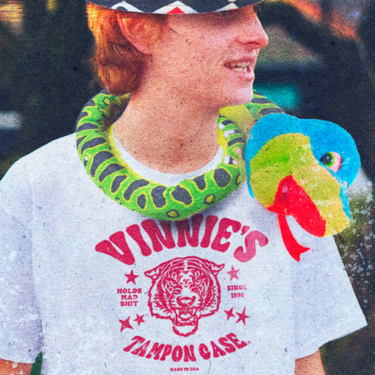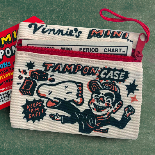HOLDS TAMPS, PADS, LINERS, CUPS, SPONGES, LIP-LINER, NUNCHUCKS, WADS OF CASH, CANS OF MACE, CHEWING GUM, EXTRA GOLD TEETH, BABY MARSUPIALS, PRESS-ON FINGERNAILS, ANTI-FASCIST FLYERS & FAKE EYEBROWS.